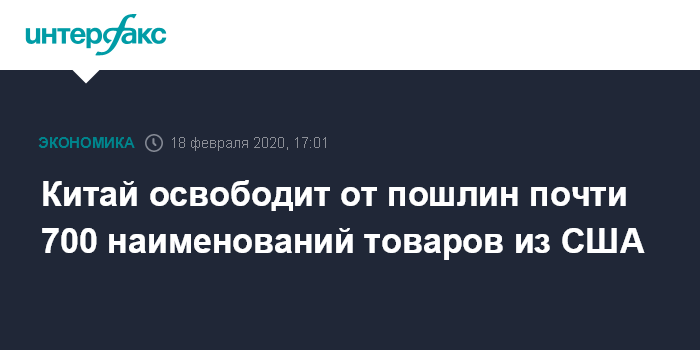 Министерство финансов КНР во вторник опубликовало список из 696 наименований американских товаров, которые будут освобождены от действия пошлин, введенных ранее Пекином в ответ на аналогичные шаги США. В список вошли, в частности, соя-бобы, свинина, говядина, кукуруза, пшеница, нефть и сжиженный природный газ (СПГ).