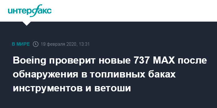 Москва. 19 февраля. INTERFAX.RU - Авиастроительный концерн Boeing пообещал проверить больше 400 новых самолетов 737 MAX после того, как перед поставкой нескольких машин клиентам в их топливных баках нашли посторонние предметы, в том числе инструменты и ветошь. Об этом сообщает Bloomberg.