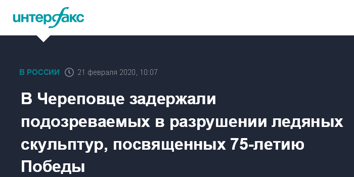 Москва. 21 февраля. INTERFAX.RU - В Череповце (Вологодская область) четверо местных жителей задержаны по подозрению в разрушении ледяных скульптур на площади Молодежи, сообщает пресс-служба регионального УМВД.