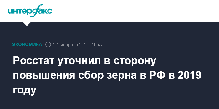 Москва. 27 февраля. INTERFAX.RU - Росстат уточнил валовой сбор зерна в РФ в 2019 году, он составил 121,2 млн тонн, сообщается в материалах ведомства. Ранее ведомство сообщало о 120,7 млн тонн.