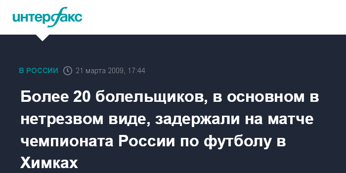 Москва. 21 марта. INTERFAX.RU - 22 человека были задержаны в субботу днем во время матча чемпионата России по футболу премьер-лиги между командами "Динамо" (Москва) и "Химки" (Московской области), который проходил на стадионе "Арена-Химки", сообщили "Интерфаксу" в Управлении информации и общественных связей ГУВД Московской области.