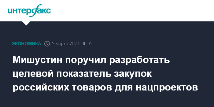 Москва. 2 марта. INTERFAX.RU - В России должна быть разработаны целевые показатели закупок российского оборудования для реализации нацпроектов, заявил премьер РФ Михаил Мишустин.