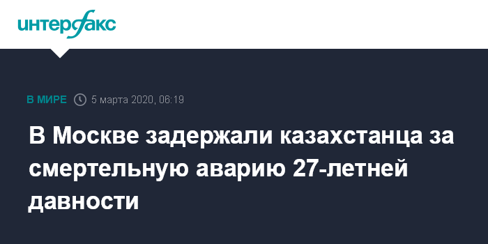 Москва. 5 марта. INTERFAX.RU - В Москве задержан мужчина, по вине которого 27 лет в Карагандинской области Казахстана произошла авария с тремя погибшими, говорится в сообщении на сайте МВД Казахстана.