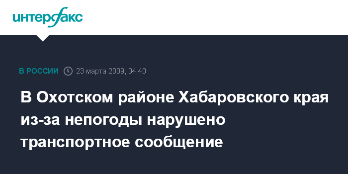 Хабаровск. 23 марта. ИНТЕРФАКС - ДАЛЬНИЙ ВОСТОК - В Хабаровском крае снегопады и сильный ветер стали причиной нарушения транспортного сообщения в Охотском районе, сообщили агентству "Интерфакс - Дальний Восток" в пресс-службе регионального управления МЧС РФ в понедельник.