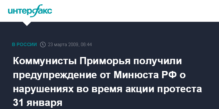 Владивосток. 23 марта. ИНТЕРФАКС - ДАЛЬНИЙ ВОСТОК - Минюст РФ направил предупреждение в отделение КПРФ в Приморье, которое, по мнению министерства, нарушило правила проведения публичных акций во Владивостоке 31 января 2009 года.