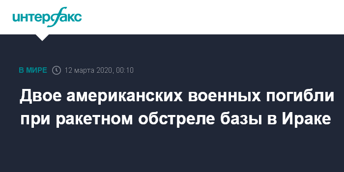 Москва. 12 марта. INTERFAX.RU - Не мене трех человек погибли в результате ракетного обстрела базы Эт-Таджи в Ираке, сообщает в среду Associated Press со ссылкой на неназванного американского чиновника.