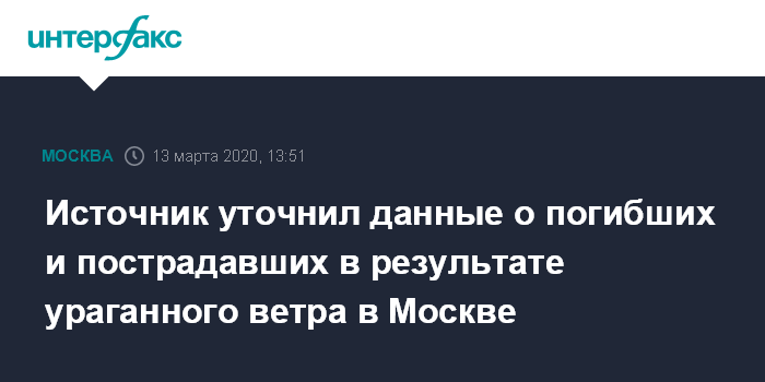 Москва. 13 марта. INTERFAX.RU - Есть один погибший и трое пострадавших в результате ураганного ветра в Москве, сообщил "Интерфаксу" источник, знакомый с ситуацией.
