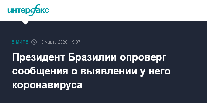 Москва. 13 марта. INTERFAX.RU - Президент Бразилии Жаир Болсонару заявил в пятницу, что сообщения о том, что он якобы заразился коронавирусом, не соответствуют действительности.