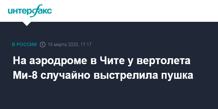 "14 марта на аэродроме Черёмушки города Чита при обслуживании 23-мм авиационной пушки вертолета Ми-8 на земле произошел одиночный непроизвольный выстрел за пределы безопасной зоны аэродрома. Пострадавших нет", - говорится в сообщении округа, поступившем в "Интерфакс".