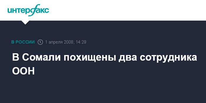 Лондон. 1 апреля. INTERFAX.RU - Во вторник на юге Сомали вооруженными людьми были похищены два сотрудника ООН, состоящие в штате Организации по продовольствию и сельскому хозяйству, передает телерадиокомпания BBC.
