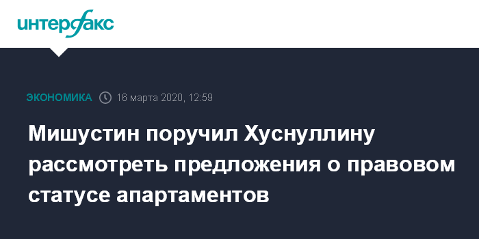 Москва. 16 марта. INTERFAX.RU - Премьер-министр Михаил Мишустин поручил вице-премьеру Марату Хуснуллину рассмотреть предложения Совета Федерации по установлению правового режима апартаментов, рассказал источник "Интерфакса", видевший текст поручения.