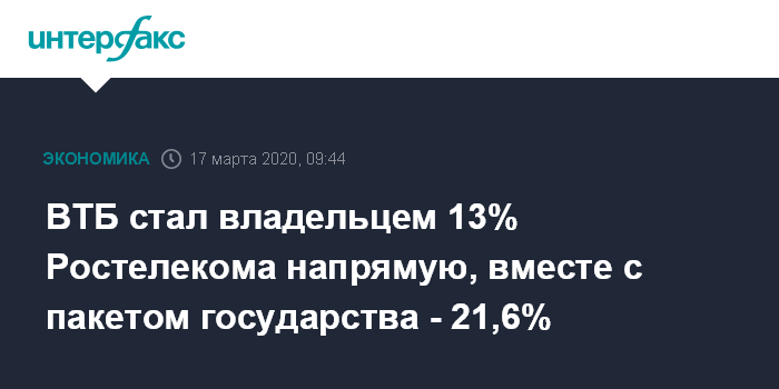 ВТБ стал владельцем 13% Ростелекома напрямую, вместе с пакетом государства - 21,6%