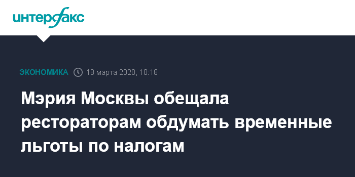 Москва. 18 марта. INTERFAX.RU - В мэрии Москвы обещали рестораторам изучить возможность предоставить им временные льготы по уплате социального налога, рассказал "Коммерсанту" участник заседания оперативного штаба мэрии по экономике. Рестораторы попросили у чиновников ряд льгот через московское отделение "Деловой России".