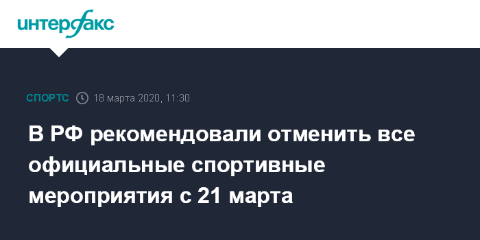 "Минспорт России рекомендует общероссийским спортивным федерациям и органам исполнительной власти субъектов Российской Федерации в области физической культуры и спорта отменить или перенести проведение всех официальных спортивных соревнований на территории РФ начиная с 21 марта 2020 года и до особого распоряжения", - говорится в сообщении.