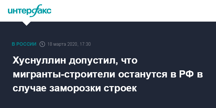 Москва. 18 марта. INTERFAX.RU - Вице-премьер РФ Марат Хуснуллин отметил, что правительство рассмотрит возможность нахождения в России иностранных строителей в случае заморозки строек из-за ситуации с коронавирусом.
