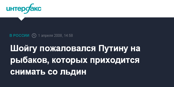 Москва. 1 апреля. INTERFAX.RU - На встрече с президентом России Владимиром Путиным глава МЧС Сергей Шойгу посетовал на безответственность рыбаков, увлекающихся подледным ловом, и заявил, что единственным средством предупредить трагедии на такой рыбалке остается лишь пропаганда. "Это больная тема. Мы изобретаем разные способы, но до 5 тыс. человек в месяц приходится снимать со льдин. Это довольно серьезные затраты для государства", - сказал министр, поделившись придуманным недавно ноу-хау: "В районе Архангельска ночью запускаем ледокол, так что утром не с чего ловить".
