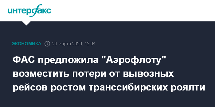 Москва. 20 марта. INTERFAX.RU - Федеральная антимонопольная служба (ФАС) требует от "Аэрофлота" обеспечить доступность цен на билеты на фоне ситуации с коронавирусом, а компенсировать возникающие в связи с этим потери предлагает увеличением транссибирских роялти.