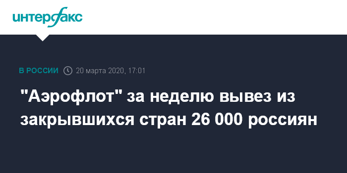 20 марта Росавиция сообщила, что эвакуацией россиян из-за рубежа займется межведомственная группа, в которую войдут дипломаты, чиновники Минтранса и Ростуризма, а также представители аэропортов Московского авиузла и авиакомпаний "Аэрофлот", "Сибирь" и "Уральские авиалинии". Группа поможет организовать спецрейсы для сограждан, которые застряли в других странах из-за закрытых границ и прерванного транспортного сообщения.