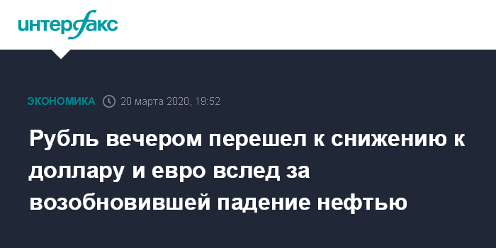 Как отмечают эксперты "Интерфакс-ЦЭА", рубль снижается к доллару и евро на вечерних торгах вслед за возобновившей падение нефтью. Ожидания снижения спроса и ценовая война на нефтяном рынке перевешивают надежды, связанные с мерами экономической поддержки со стороны властей в условиях пандемии, вызванной коронавирусом COVID-19.
