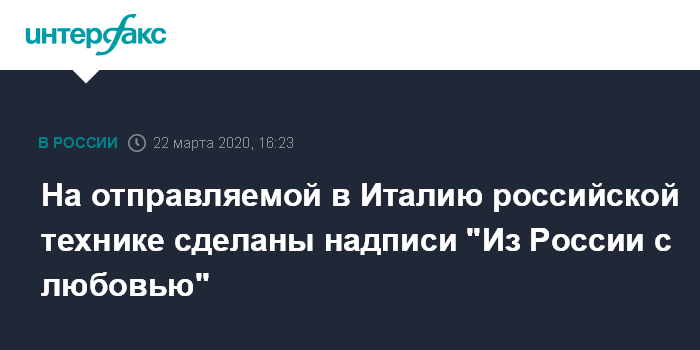 Москва. 22 марта. INTERFAX.RU - Надписи "Из России с любовью" на русском, английском и итальянском языках сделаны на технике, которую Минобороны России направляет в Италию в рамках помощи в борьбе с коронавирусом.