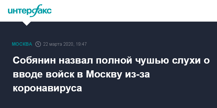 Москва. 22 марта. INTERFAX.RU - Мэр Москвы Сергей Собянин категорически опроверг информацию, распространяемую в соцсетях, о якобы вводе войск в столицу для контроля ситуации с коронавирусом.