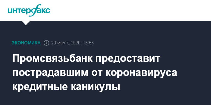 Москва. 23 марта. INTERFAX.RU - Промсвязьбанк предоставит пострадавшим от коронавируса клиентам кредитные каникулы на срок до двух месяцев, говорится в пресс-релизе банка.