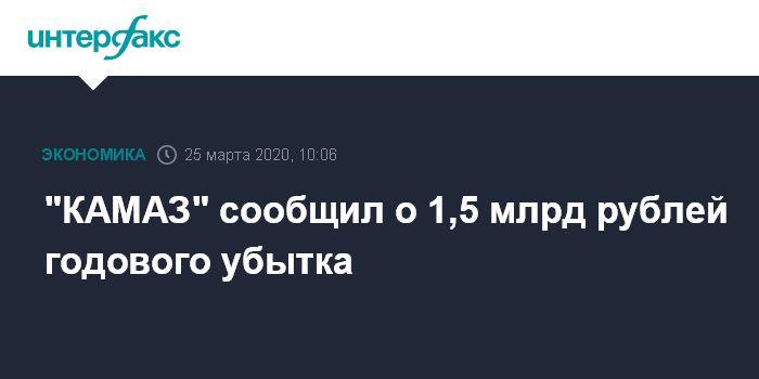 Москва. 25 марта. INTERFAX.RU - Чистый убыток "КАМАЗа" по РСБУ в 2019 году составила 1,5 млрд рублей против чистой прибыли 27 млн рублей годом ранее, сообщила компания.