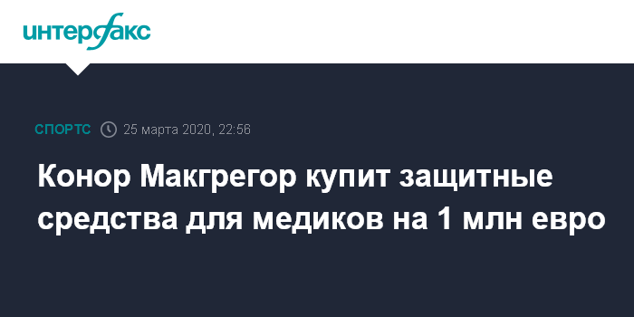 Москва. 25 марта. INTERFAX.RU - Ирландский боец ММА Конор Макгрегор в среду пообещал потратить 1 млн евро на покупку защитных средств для медиков и медперсонала в Ирландии, которые работают с заразившимися коронавирусом COVID-19 пациентами.