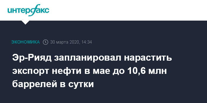 Москва. 30 марта. INTERFAX.RU - Саудовская Аравия планирует в мае увеличить экспорт нефти на 600 000 баррелей в сутки, до общего объема 10,6 млн б/с, сообщил представитель Минэнерго королевства.