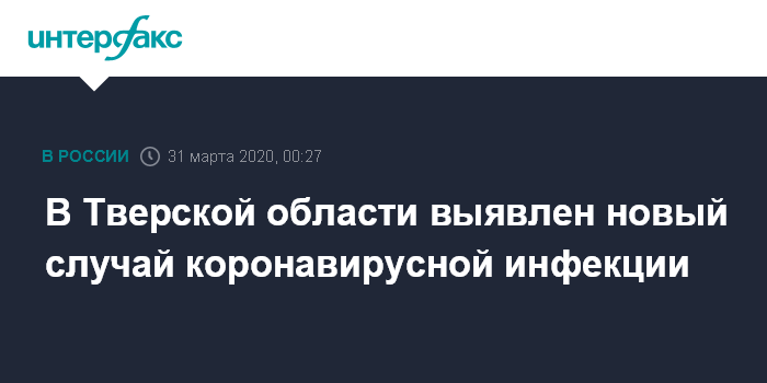 Москва. 31 марта. INTERFAX.RU - По состоянию на 30 марта в Тверской области выявлен новый случай коронавирусной инфекции, сообщили во вторник "Интерфаксу" в пресс-службе регионального правительства.