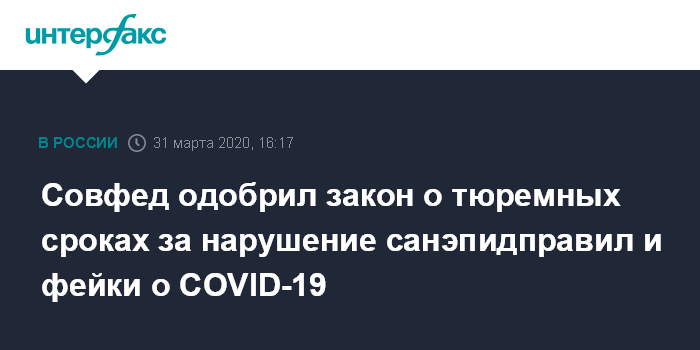 Москва. 31 марта. INTERFAX.RU - Совет Федерации одобрил закон об уголовной ответственности за нарушение санитарно-эпидемиологических правил и распространение фейков о чрезвычайных ситуациях. Документ был разработан в связи с ситуацией, вызванной распространением коронавируса.