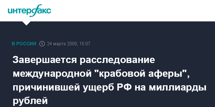 Москва. 24 марта. INTERFAX.RU - В России близится к завершению расследование преступной деятельности международной группировки - организатора громкого "крабового дела". Следователи оценивают нанесенный государству ущерб в 11,5 млрд рублей.