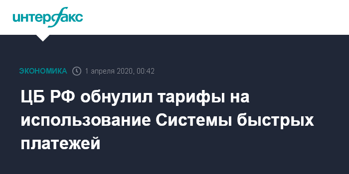 Москва. 1 апреля. INTERFAX.RU - ЦБ РФ обнулил тарифы для банков за обслуживание в Системе быстрых платежей (СБП) на срок с 1 апреля 2020 года по 30 июня 2022 года, сообщил ранее регулятор.