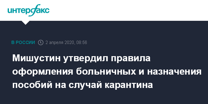 Москва. 2 апреля. INTERFAX.RU - Премьер-министр РФ Михаил Мишустин утвердил временные правила оформления больничных, а также назначения и выплаты пособий по временной нетрудоспособности в случае карантина для лиц старше 65 лет.