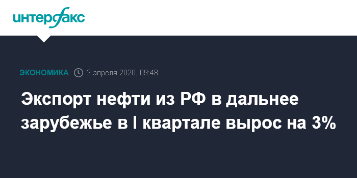 Москва. 2 апреля. INTERFAX.RU - Экспорт российской нефти в страны дальнего зарубежья в I квартале 2020 года составил 62,98 млн тонн, что на 3% выше аналогичного показателя 2019 года, сообщается в оперативной сводке ЦДУ ТЭК. Среднесуточный экспорт зафиксирован на уровне 5,07 млн баррелей. Поправка на високосный год учтена.