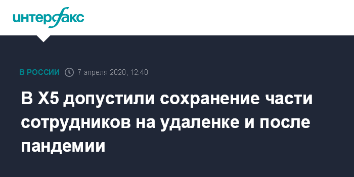 Москва. 7 апреля. INTERFAX.RU - X5 Retail Group (объединяет торговые сети "Пятерочка", "Перекресток" и "Карусель") может оставить часть сотрудников в режиме удаленной работы и после отмены ограничений, связанных с коронавирусом, сообщил гендиректор компании Игорь Шехтерман.