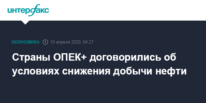 Москва. 10 апреля. INTERFAX.RU - Страны ОПЕК+ по итогам переговоров выпустили заявление, где подтвердили намерение снизить нефтедобычу в мае-июне на 10 млн баррелей в сутки, говорится в документе.