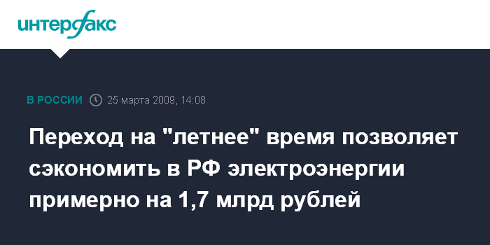 Москва. 25 марта. INTERFAX.RU – Переход на "летнее" время в РФ позволяет сэкономить с апреля по октябрь примерно 2 млрд кВт.ч электроэнергии, что сопоставимо с объемом электропотребления в целом по ЕЭС России за сутки, сообщили "Интерфаксу" в ОАО "Системный оператор ЕЭС", которое занимается диспетчеризацией энергосистемы РФ.