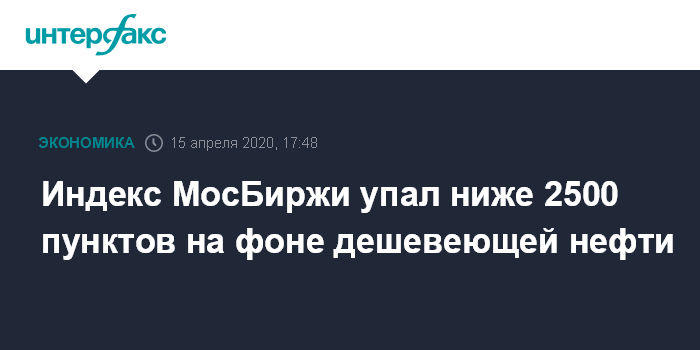 Москва. 15 апреля. INTERFAX.RU - Индекс МосБиржи, один из основных российских фондовых индикаторов, вечером в среду упал ниже рубежа 2500 пунктов, обновив минимум с начала апреля на фоне общемировых распродаж на фондовых площадках и падения нефти из-за сокращения спроса на сырье в условиях мирового карантина из-за коронавируса COVID-19.