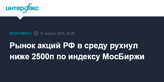 Москва. 15 апреля. INTERFAX.RU - Рынок акций РФ в среду упал вслед за мировыми площадками и нефтью из-за сокращения спроса на сырье в условиях мирового карантина из-за COVID-19, причем негатива добавила слабая статистика из США; индекс МосБиржи упал ниже 2500 пунктов, обновив минимум с начала апреля.