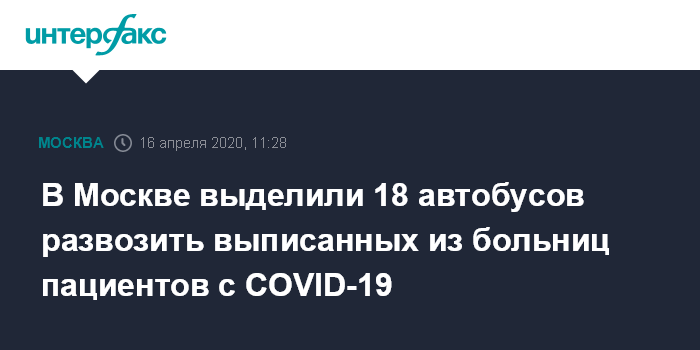 Москва. 16 апреля. INTERFAX.RU - Департамент транспорта Москвы сообщил, что выделил 18 автобусов, которые развозят по домам людей, выписанных из больниц после заражения коронавирусом. При необходимости чиновники готовы выделить дополнительные машины для этого.