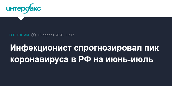 Москва. 16 апреля. INTERFAX.RU - Врач-инфекционист Николай Малышев считает, что пик эпидемии коронавируса в России будет в июне-июле.