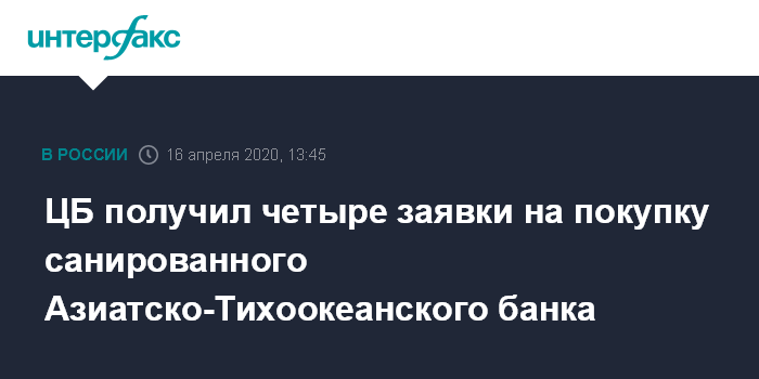 Москва. 16 апреля. INTERFAX.RU - Банк России получил четыре уведомления от лиц, заинтересованных принять участие в покупке санированного Азиатско-Тихоокеанского банка (АТБ), следует из материалов регулятора. Прием заявок завершился 15 апреля. ЦБ начинает изучать финансовое положение и репутацию заявителей.