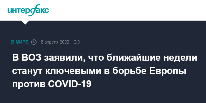 Москва. 16 апреля. INTERFAX.RU - Развитие событий в ближайшие недели в европейских странах станет определяющим в том, что касается борьбы против коронавируса COVID-19, заявил в четверг директор Европейского регионального бюро Всемирной организации здравоохранения (ВОЗ) Ханс Клюге.
