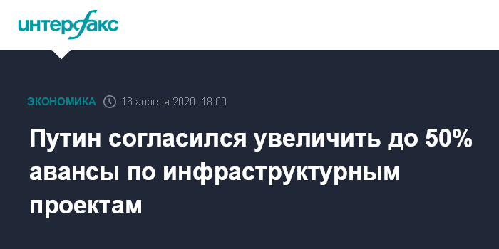 Москва. 16 апреля. INTERFAX.RU - Президент РФ Владимир Путин согласился с просьбой строительных компаний увеличить до 50% авансирование контрактов по инфраструктурным проектам.