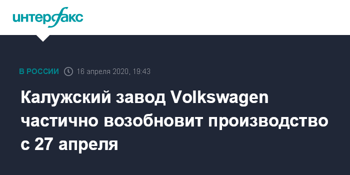 Москва. 16 апреля. INTERFAX.RU - ООО "Фольксваген Груп Рус" (российское подразделение германского автомобилестроительного концерна Volkswagen) начнет постепенное возобновление производства на заводе в Калуге с 27 апреля, сообщили "Интерфаксу" в пресс-службе предприятия.
