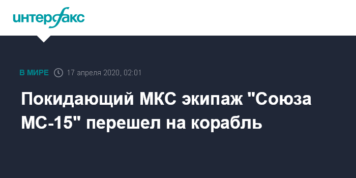 Москва. 17 апреля. INTERFAX.RU - Россиянин Олег Скрипочка и американцы Эндрю Морган и Джессика Меир, покидающие в пятницу Международную космическую станцию (МКС), перешли в корабль "Союз МС-15" и задраили переходные люки.