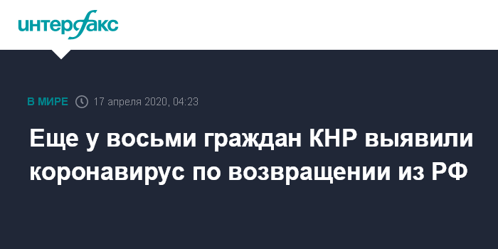 Москва. 17 апреля. INTERFAX.RU - В минувший четверг медики граничащей с Россией китайской провинции Хэйлунцзян подтвердили заражение коронавирусом у восьми прибывших из России граждан КНР, сообщил провинциальный Комитет здравоохранения на своем сайте.