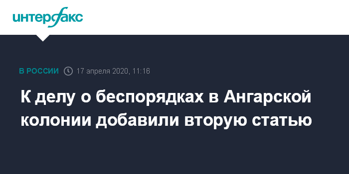 Москва. 17 апреля. INTERFAX.RU - В Иркутской области возбуждены еще два уголовных дела по фактам беспорядков и поджога в Ангарской колонии, сообщила пресс-служба СКР. Это дела по статьям о дезорганизации деятельности колонии с применением насилия (ч.3 ст. 321 УК) и об организации и участии в массовых беспорядках (ч. 1 и ч. 2 ст. 212 УК).