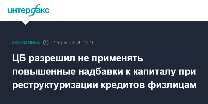 Москва. 17 апреля. INTERFAX.RU - Банки РФ смогут не применять повышенные надбавки к достаточности капитала при реструктуризации кредитов физлицам в период с 1 марта по 30 сентября 2020 года, говорится в сообщении банка.